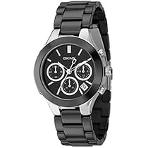 Buying DKNY Women's NY4914 Black Ceramic Quartz Watch with Black Dial Dress watch, Japanese quartz movement, Chronograph featuring 24-hour, 60-minute and chronograph seconds subdials, Polished silver-tone hands with luminous accents and sweep seconds, Polished silver-tone hands mark subdials, Applied polished silver-tone baton markers, White Arabic numbers and indices mark subdials, Analog date aperture between four and five o'clock, Black dial with polished silver-tone logo applique, Gleaming black ceramic bracelet with push-button-clasp, Gleaming black ceramic bezel, Polished silver-tone stainless steel round case, Textured